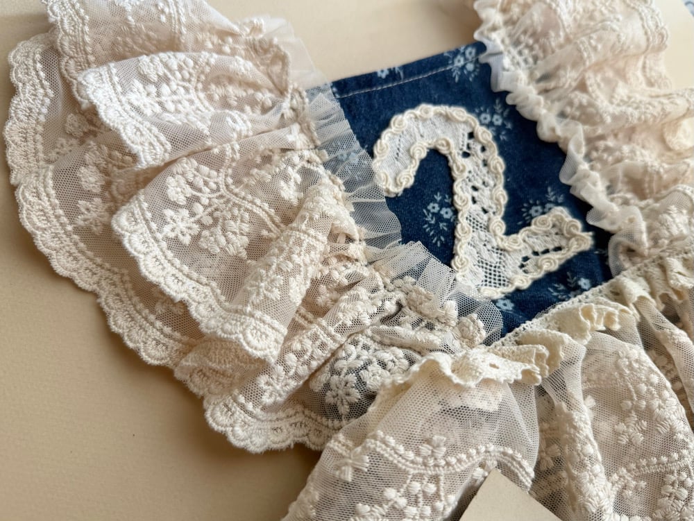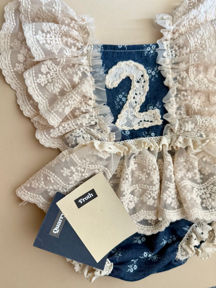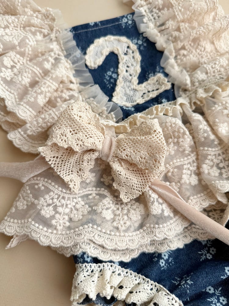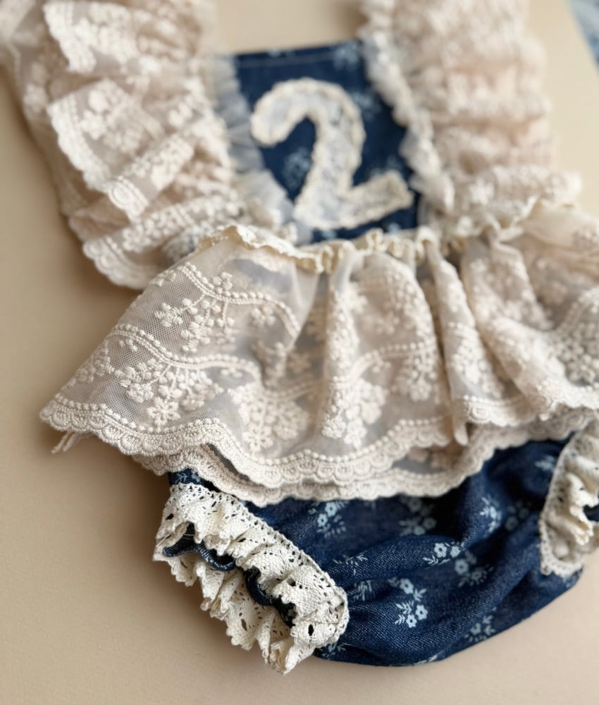 Show stopping 2/3 two piece set perfect for capturing her 2 year milestone! Vintage lace and denim photographs so beautifully. The top is fully adjustable and stretches at waist!